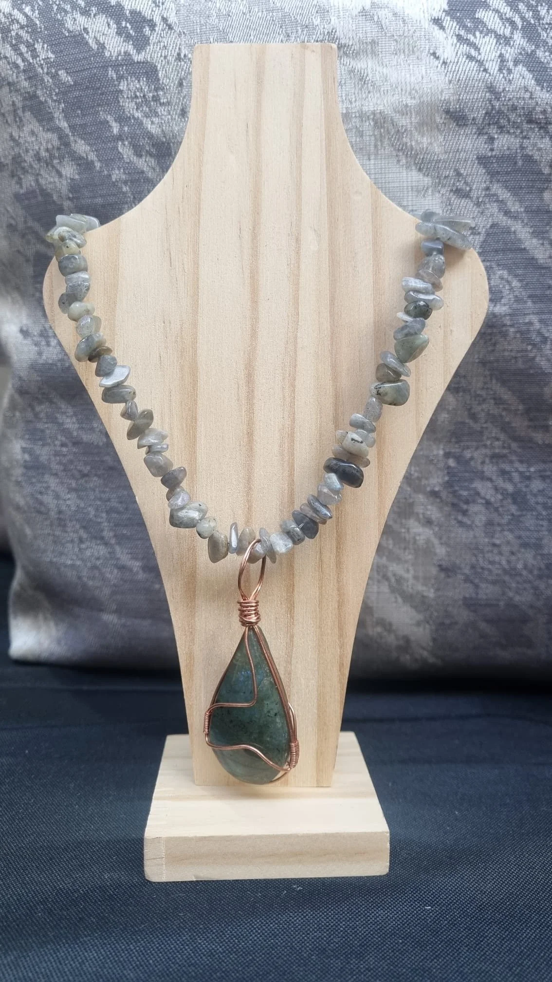A transformation necklace, finished with a copper clasp, a copper wrapped labradorite cabochon sits upon a string of labradorite chip beads. Copper to enhance the natural magic of these crystals, aiding in strengthening the spiritual connection